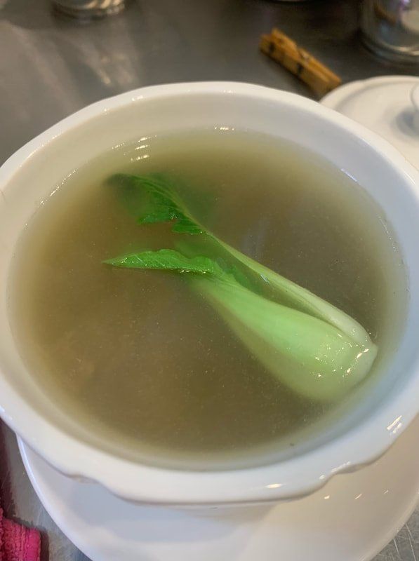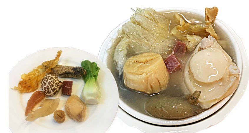 Ingredients included: abalone, sea cucumber, shark fin, fish maw, jinhua ham, dried scallops, pearl meat, shiitake mushroom and bok choy.